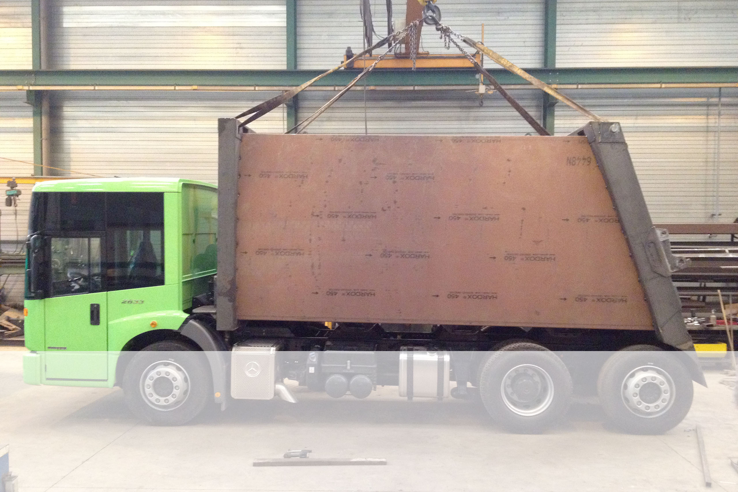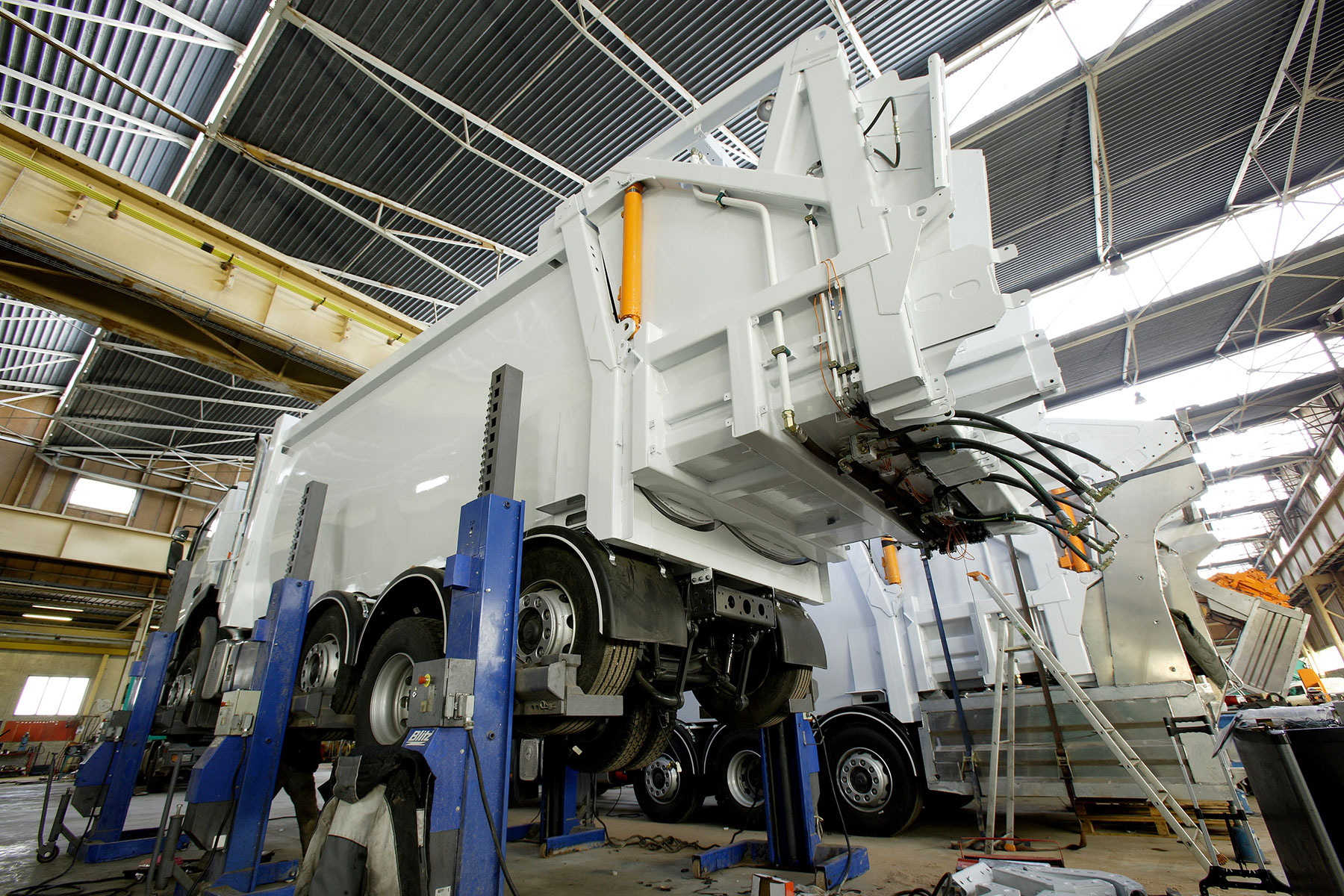 Véhicule breveté permettant la collecte simultanée en porte à porte du verre, des emballages et papiers, et des ordures ménagères résiduelles.